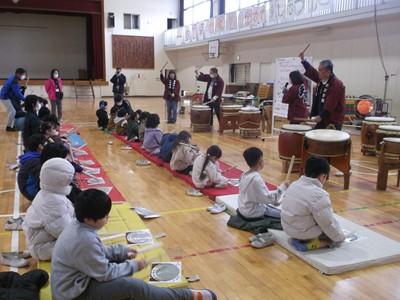「天馬太鼓」のみなさんの迫力のある演奏に、子どもたちは目を輝かせ、真剣にお話を聞いていました。