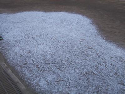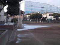 今朝は少し雨が降ったのか…校庭が白くなっていました。「雪(^^♪」と喜ぶ子ども達…あっという間に足跡で一杯になりました。