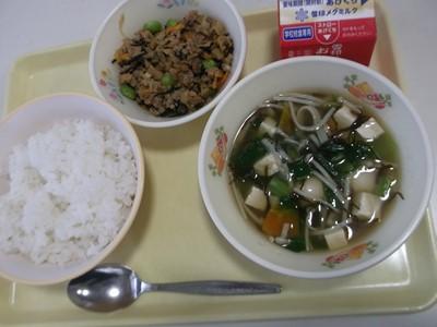 肉味噌丼は、給食初メニューと思われます。たっぷりの豚挽き肉と大豆ミートに、人参・玉ねぎ・枝豆・ひじきと色鮮やかな具材を混ぜ、豆板醤で少しピリッと感が味わえるご飯が進む一品でした。もずく汁は香りも味もほっとするお汁でした。もずくと糸かまぼこのツルツル感が、少し早めの夏を感じさせてくれました。今日も美味しい給食でした!(^^)!