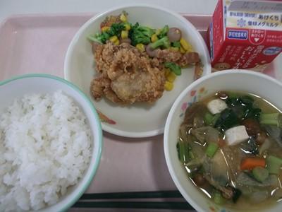 ご飯・牛乳・鶏肉のから揚げ・ウインナーのソテー・なめこ汁