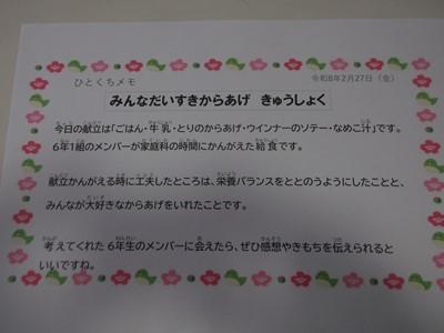 今日は6年1組のメンバーが家庭科で考えたメニューでした。「みんな大好き唐揚げ給食(^^)/」タイトルの通り、2月の献立が配られてから、ずっとこの日を楽しみにしていた子も、多かったようです。栄養士さんも、完成した給食を見て「彩の美しさ」に感嘆の息をのんでいました。みんな大好きなめこ汁(^^)/には、市内産のネギ・小松菜・味噌が入っていました。2月ラストの給食も最高でした。ご馳走様でした。