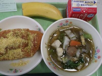 カレー揚げパン・牛乳・ちゃんこ汁・バナナ