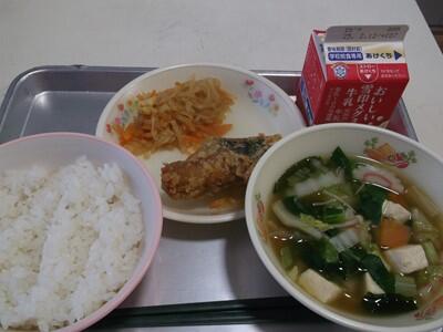 ごはん・牛乳・鯖の竜田揚げ・ひきな炒り・すまし汁