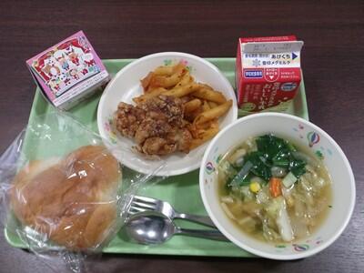 ロールパン・牛乳・甘辛フライドチキン・ペンネアラビアータ・白菜スープ・クリスマスケーキ