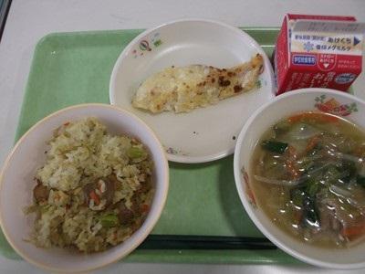 カレーピラフ・牛乳・魚のコーンマヨネーズ焼き・野菜スープ