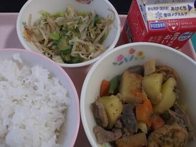 ひっつみは、岩手県の郷土料理です。ひっつみとは、小麦粉・白玉粉・でんぷん・水を混ぜた生地をちぎったものです。10種類の具材が入った汁に、調理員さんが手作業でひっつみをひとつずつちぎって作ってくださいました。もちもちとした弾力があっておいしかったです。スパイシーポテトには、チリパウダーとパプリカパウダーが入っていて、明るい色を添えてくれました。今日もご馳走様でした。