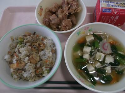 今年度、初めての自校ご飯(^^♪それも、大人気の「カレーピラフ」です。鶏肉・ウインナーと子ども達の大好き食べ物が入って、子ども達もホクホク笑顔だったようです。枝豆・パセリ・人参・玉ねぎ・マッシュルームも入って豪華なピラフでした。シシャモのフリッターは、いつものようにカリッと揚がり、中はジューシーで揚げたて感を感じました。子ども達が元気になるメニューでした(*^^*)ご馳走様でした