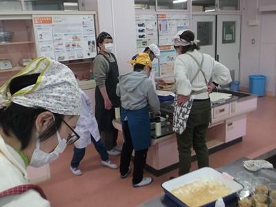 今日も、昨日からひな祭りが続いているような錯覚を起こしそうな、豪華メニューでした。6-2だけは卒業前の特別デザート「シューアイス」が付いています。子ども達の嬉しそうな顔が浮かびます。菜の花の胡麻和えに入っている菜花、人参は市内産だそうです。赤・緑・白と彩り美しく、胡麻の風味が効いて美味しい一品でした。