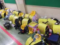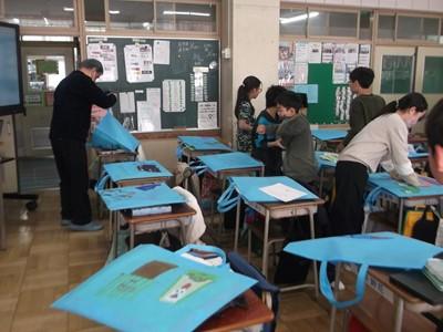 1年間、楽しんだ図工の作品を入れる不織布の「大きなバッグ」に、思い想いの絵を描いて、作品をバッグに入れました。1年生はランドセルを廊下に出して…ロッカーの中に作品を入れていきました。それぞれの学年の工夫が見られます。