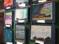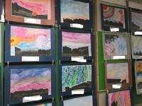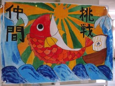 6年生の教室外廊下には、運動会で全力を尽くした余韻を感じさせる大漁旗が飾られていました。図工で描いたそれぞれの「空」が大漁旗を包んでいます。