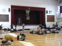 体育館脇にトラックが2台停まっていました。朝早くから劇団ポプラの方々が準備を始めていました。子ども達が楽しみにしている「シンドバットの大冒険」の劇をしてくださる劇団さんが学校にやってきました。