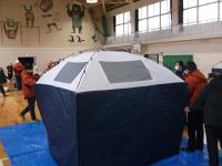 50個ある簡易テントを全ては出せませんでしたが、皆で力を合わせて組み立てて、避難所になった時の体育館をイメージしました。