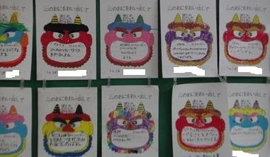 1年生教室前には、節分(2/3)のために描いた「鬼」が並んでいました。「泣き虫鬼を追い払いたい」「怒りんぼを直したい」「宿題をすぐできるようにしたい」子ども達の、心の中の困りごとを垣間見た気持ちでした。。長所と短所は背中合わせ。いい所をたくさん伸ばしていきたいです。