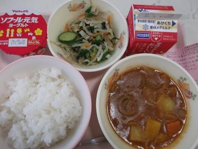 ハヤシライス:朝からルーの香りが漂い、子ども達の期待感も膨らんでいた様です。豚肉・人参・じゃが芋・玉ねぎ・マッシュルームを使い、トマト、ケチャップ、ソース、赤ワインで味付けをし、仕上げにチーズを加えてくださったそうです。干ぴょうサラダは、きゅうり、人参、もやし、ほうれん草のシャキシャキ感が手作りドレッシングとよく合っていました。今日もご馳走様でした(^^)v