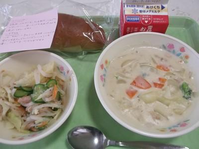 ホワイトシチューは、鶏肉・じゃが芋・玉ねぎ・人参・ブロッコリー・白いんげん豆ペーストを使って作って戴きました。生クリームと牛乳と具がマッチして優しい味のシチューでした。黒パンに付けて食べるとまた味わい深い感じでした。ツナサラダは、ツナ・キャベツ・きゅうり・大根・人参と彩がよく食をそそります。ドレッシングにニンニクが効いてパンチがきいていました。ご馳走様でした(^^)v