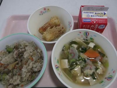 鶏ごぼうご飯・牛乳・すまし汁・竹輪の胡麻揚げ