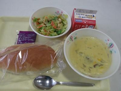 コッペパン・牛乳・コーンクリームスープ・豆サラダ・ブルーベリージャム