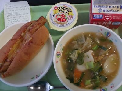 『ビザドッグは、ドッグ用のパンに、ボイルしたウインナー、手作りピザソース、チーズを乗せてオーブンで焼きました。トック入りキムチスープは、鶏肉、トック(韓国もち)、玉ねぎ、人参、ネギ、大根、小松菜、しめじ、白菜、キムチ、味噌を使って作りました。ピリ辛で温まってもらえると良いです。3学期も美味しく食べて貰えたらいいですね)』と栄養士さんからのメモがありました。フワフワパンのピザドッグ、ピリ辛で具沢山のキムチスープ…そしてストロベリーゼリー(*^-^*)本当に美味しかったです。3学期もどうぞ宜しくお願いいたします。