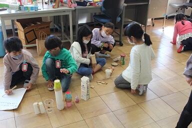 1年生 2年生と一緒に行った「おもちゃランド」の経験を生かして、今度は自分たちでおもちゃを作りました。