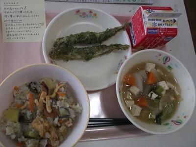 吹き寄せごはん・牛乳・ししゃもの磯部揚げ・かぶの味噌汁