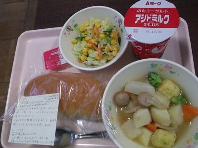 今日のポトフは、地場産のかぶと、鶏肉・フランク・野菜つみれ・じゃが芋・玉ねぎ・人参・ブロッコリーを塩、胡椒・醤油・ブイヨンで味付けされ…食材のそれぞれの旨味たっぷりの、栄養満点メニューでした。コーンサラダは地場産のキャベツときゅうり・トウモロコシなどを、特製ドレッシング(レモン果汁・砂糖・からし・酢、油、を塩・胡椒で混ぜた物)でからめていて、それぞれの食材の美味しさを引き出してくれているようでした。いちごジャムマーガリンは、久しぶりにお目にかかれて嬉しかったです。明日で給食終了です( ;∀;)