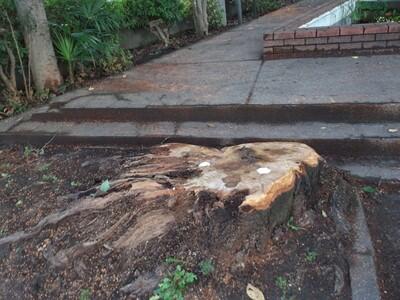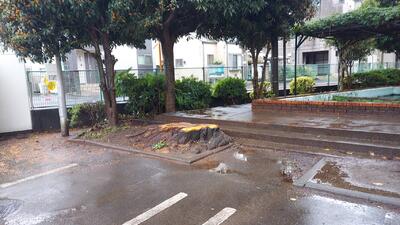 正門前の大きな桜の木1本と…お別れしました。桜は2本ある内の1本です。幹の中が腐ってしまっていて、もう切らなくてはならない時期にきていました。